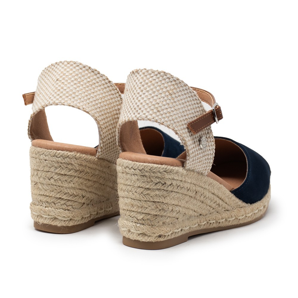 Su color navy es versátil y fácil de combinar, ideal para llevar tanto en el día a día como en ocasiones más especiales. La suela de esparto le da un toque tradicional y auténtico, mientras que la correa ajustable asegura un ajuste perfecto y cómodo.