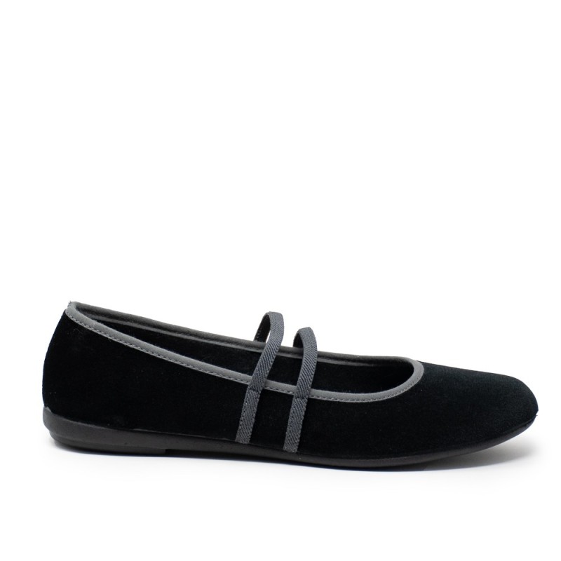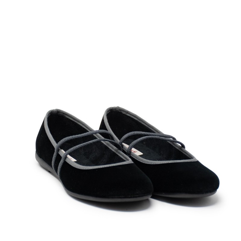 Estas bailarinas están fabricadas en terciopelo negro, un material suave y elegante que le da un toque sofisticado a cualquier outfit. El diseño de dos gomas en el empeine asegura un ajuste perfecto y cómodo, permitiendo que tus pies se sientan libres y ligeros durante todo el día.