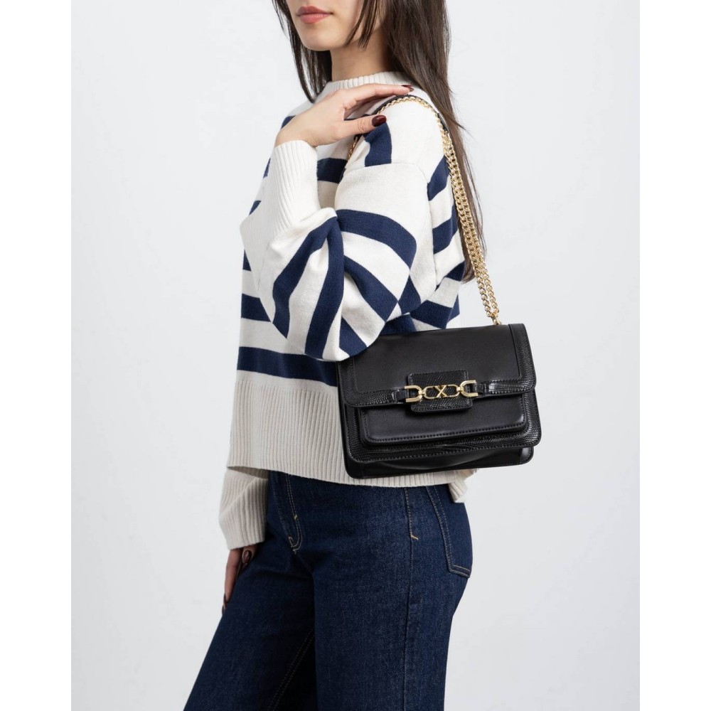El bolso está fabricado en material resistente y duradero, lo que garantiza su calidad y durabilidad a lo largo del tiempo. Su color negro le da un toque sofisticado y versátil que combina fácilmente con cualquier estilo.