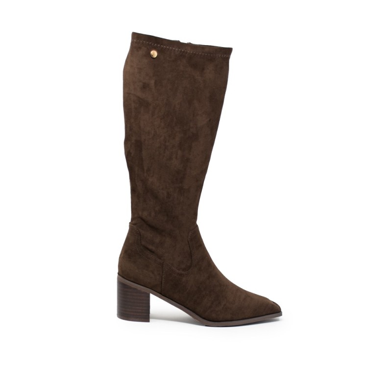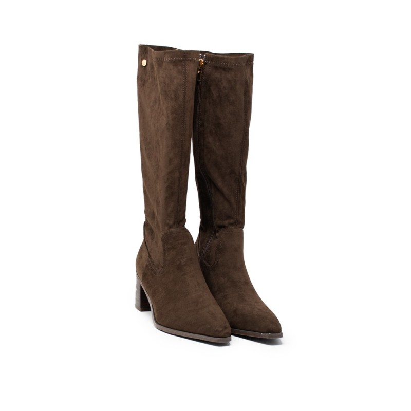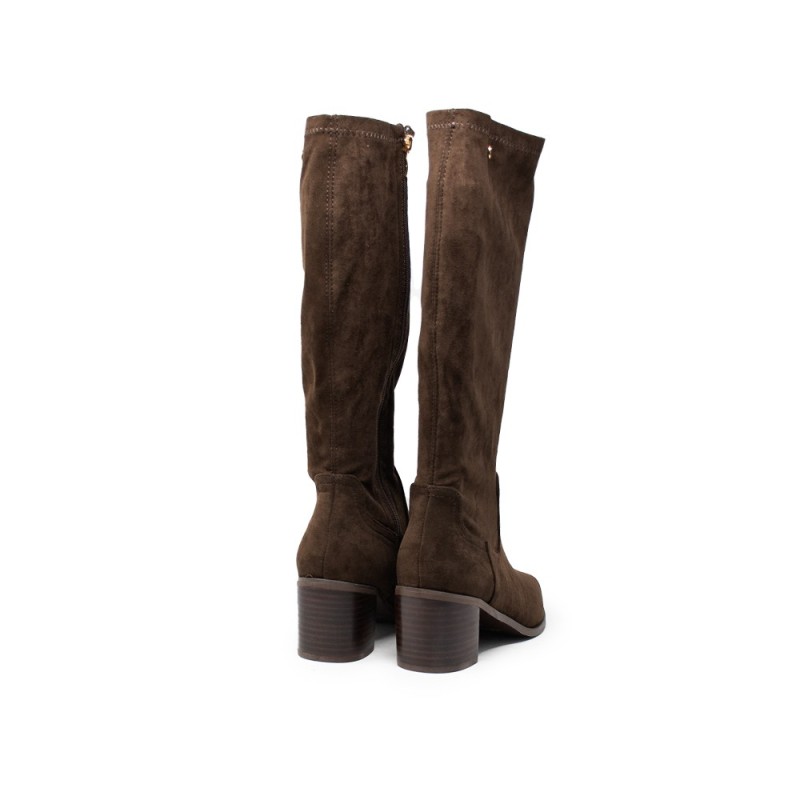 Estas botas están confeccionadas en material elástico que se adapta perfectamente a la forma de tu pierna, ofreciendo un ajuste cómodo y favorecedor. El color moka es ideal para combinar con una amplia variedad de colores y estilos, lo que las convierte en un calzado versátil y fácil de integrar en tu vestuario.