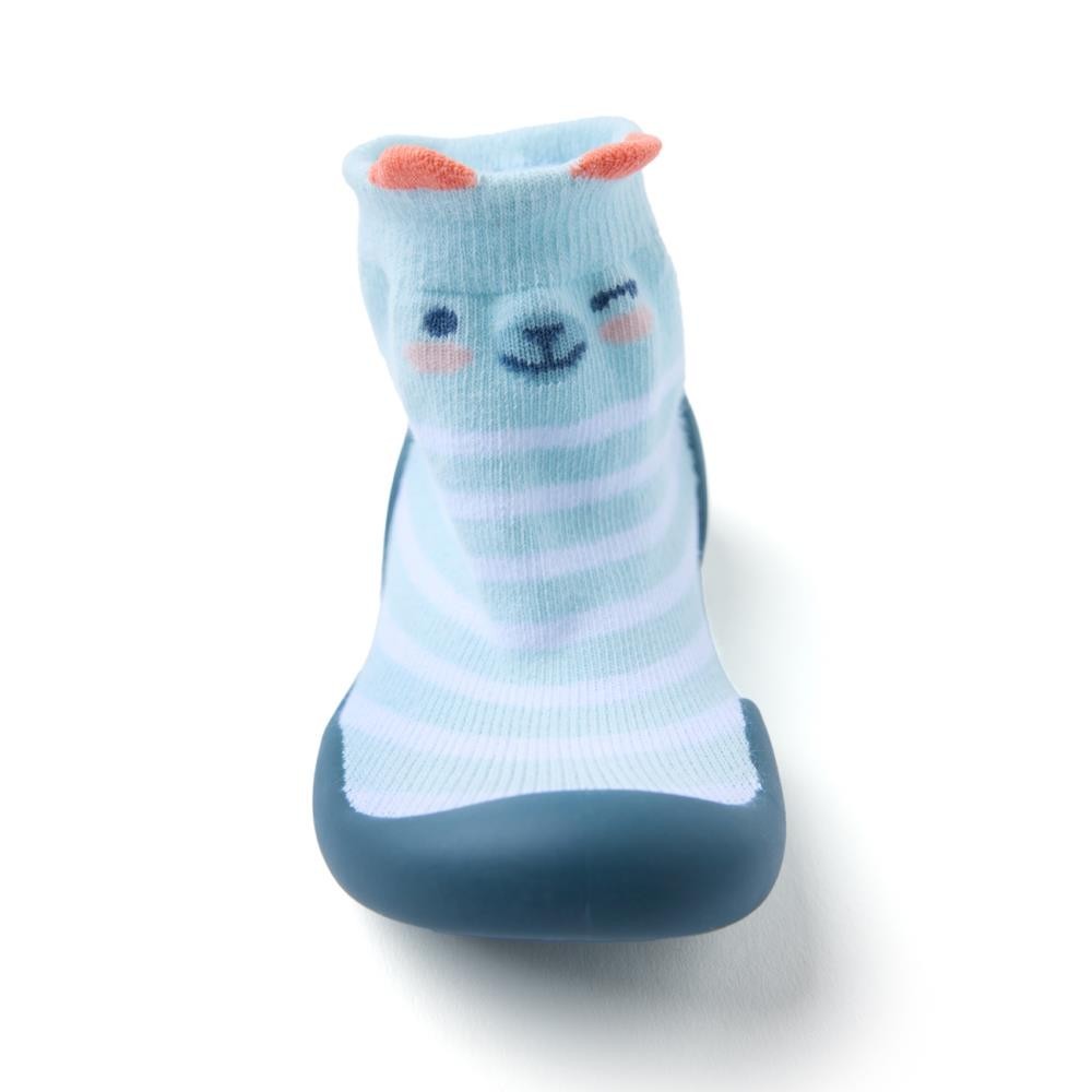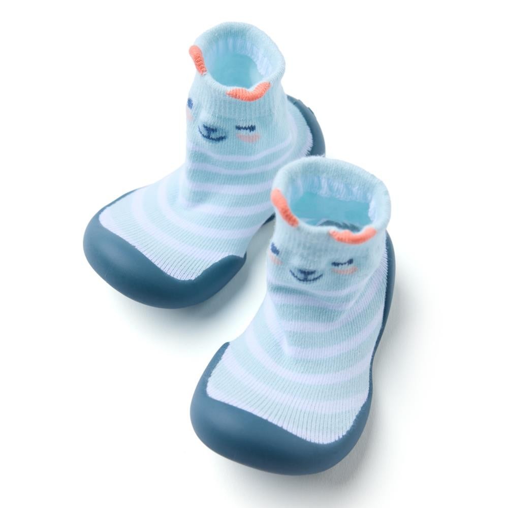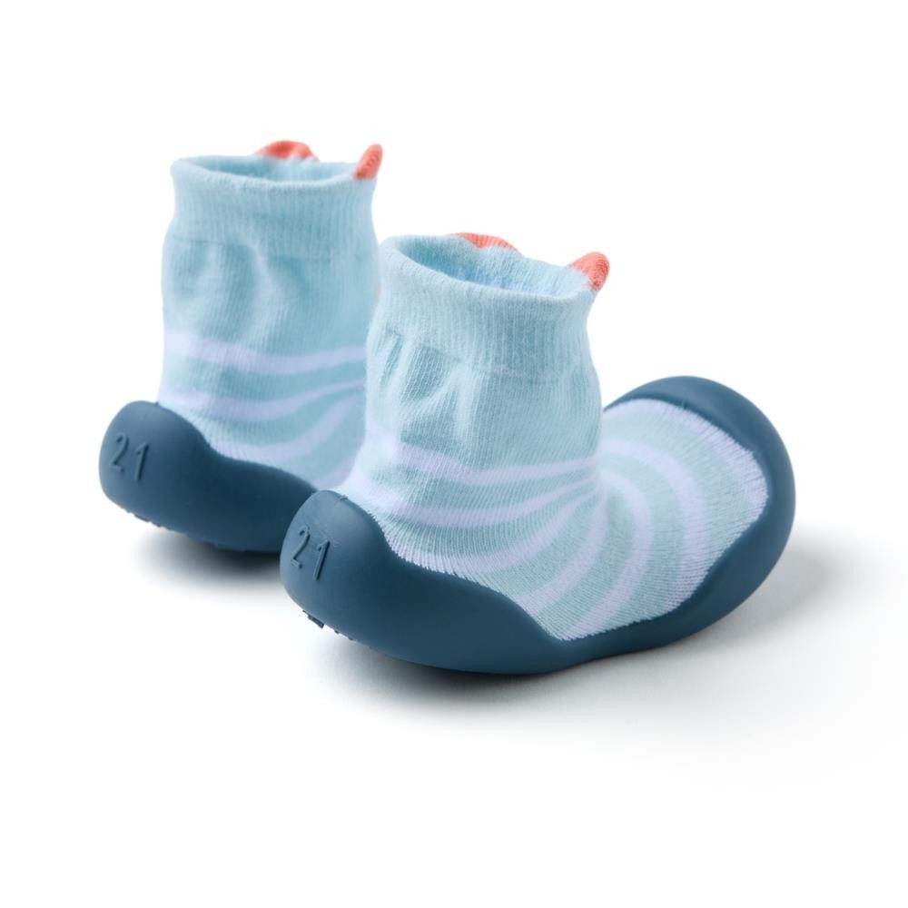 Este calcetín está diseñado con un estampado de rayas en tonos azules, lo que le da un toque divertido y original. Además, cuenta con una suela antideslizante que evita resbalones y caídas, especialmente en superficies lisas como el parqué o el mármol.