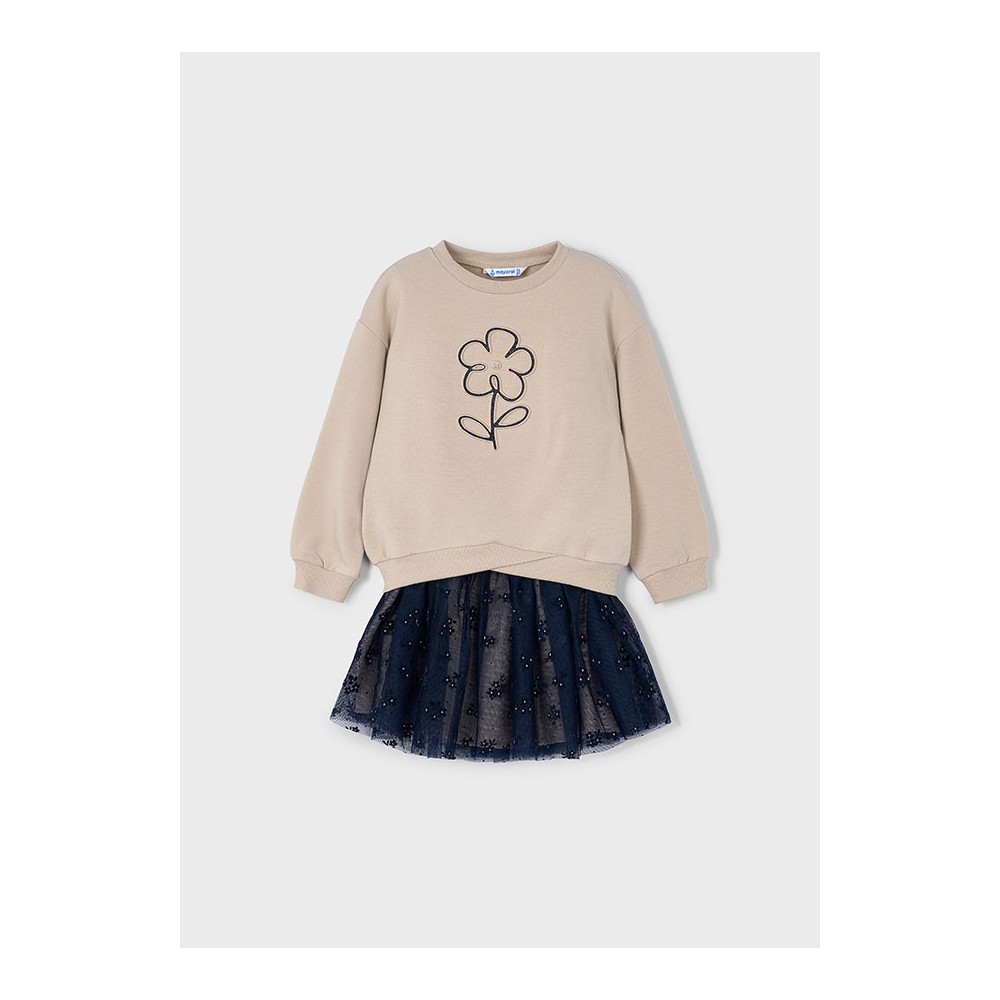 ¡Este conjunto de falda y camiseta es perfecto para las niñas que adoran la moda! La marca Mayoral ha creado este conjunto en color marino con detalles de tul que le dan un toque de fantasía y elegancia.