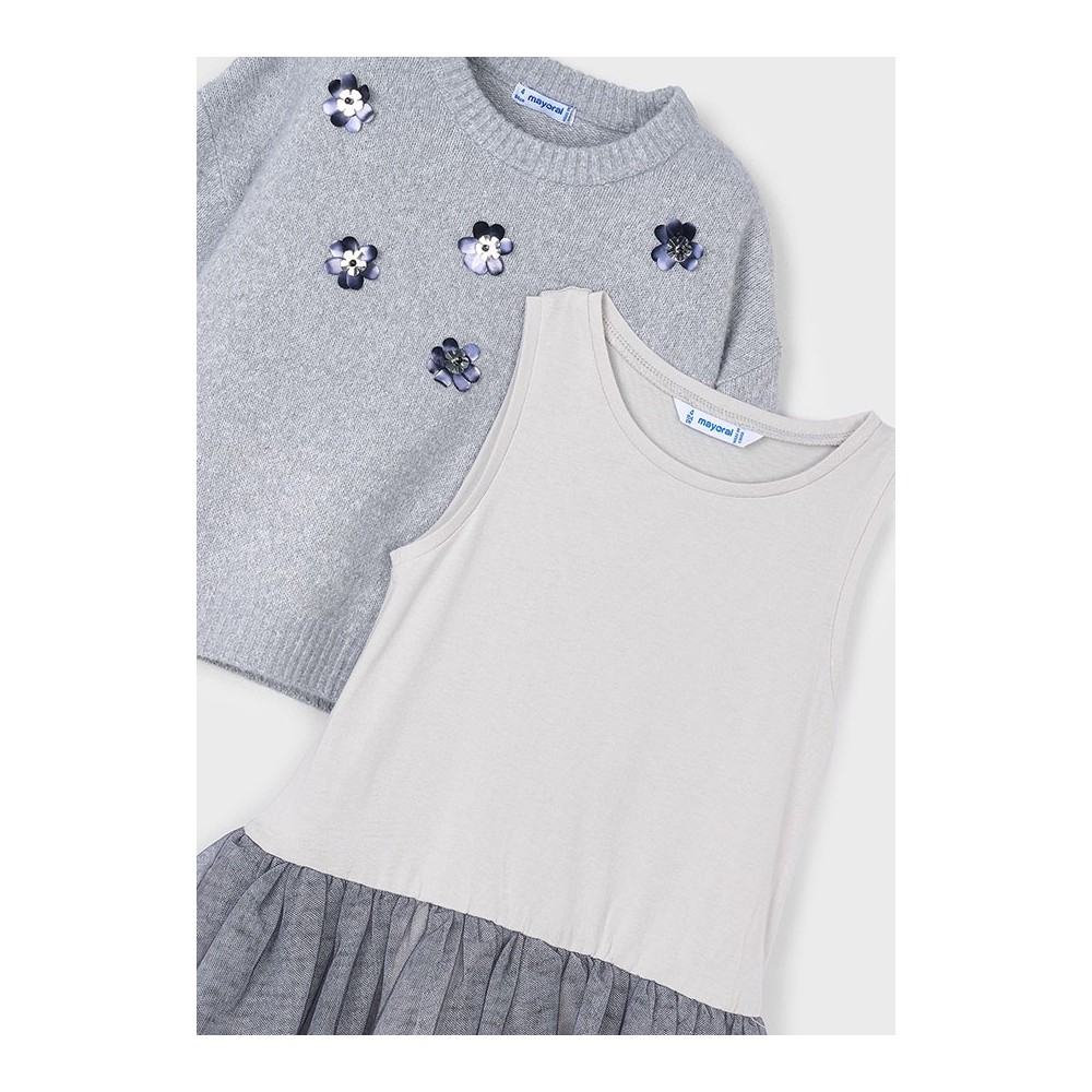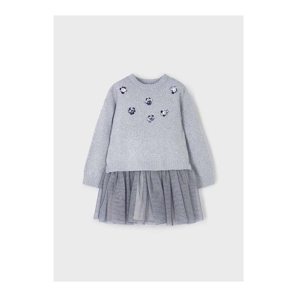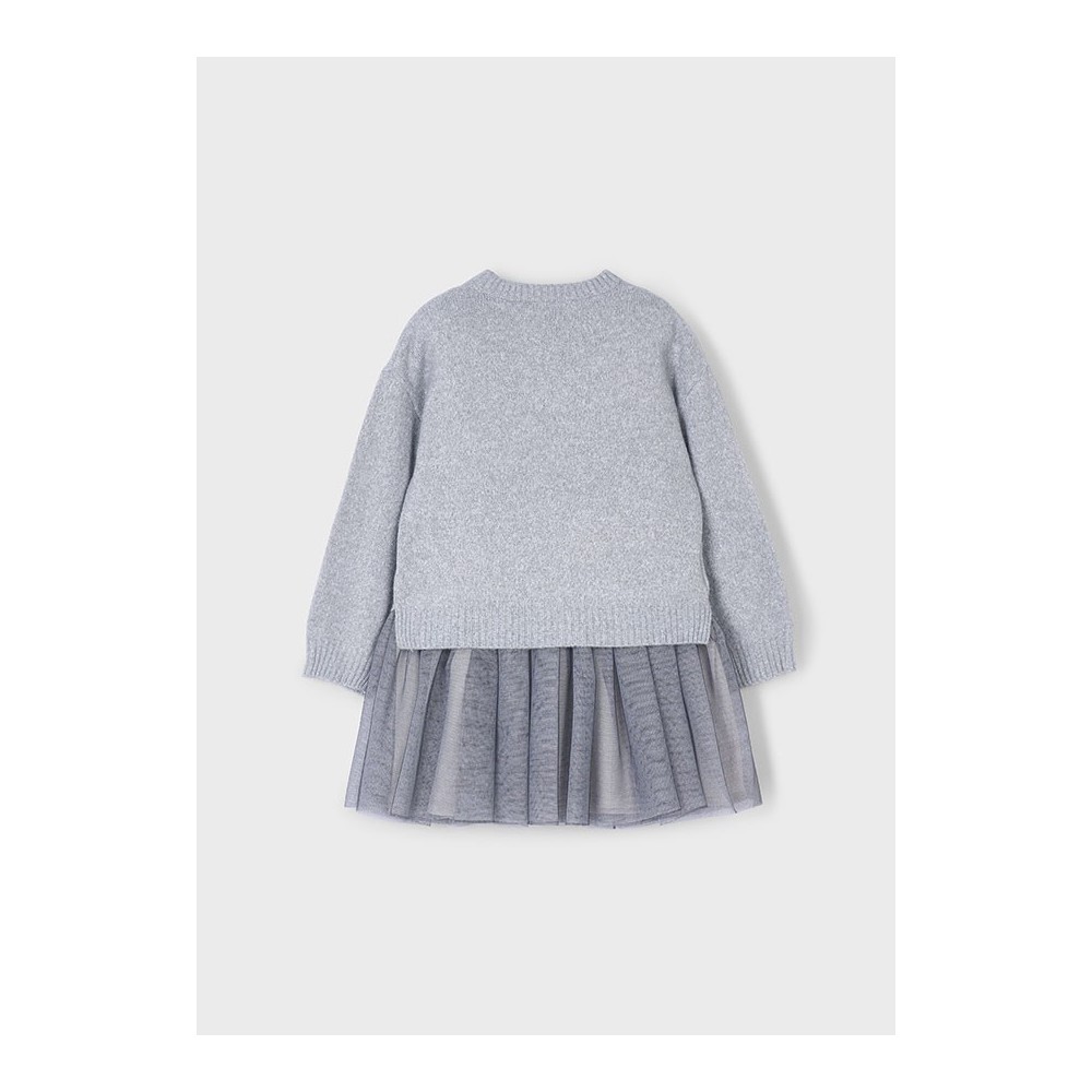 Este hermoso vestido tricot combinado en plata de la reconocida marca Mayoral es la elección perfecta para tu pequeña fashionista. Con un diseño elegante y moderno, este vestido se convertirá en la pieza estrella de su armario.