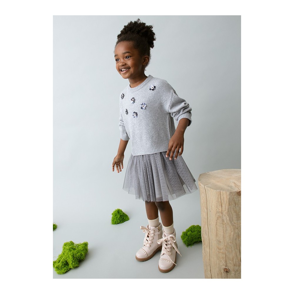 Este vestido tricot combinado en plata es una prenda versátil que se puede usar en diversas ocasiones. Desde fiestas familiares hasta salidas informales, tu hija lucirá radiante con este elegante vestido. Combínalo con unos zapatos a juego y unos accesorios sencillos para completar el look.