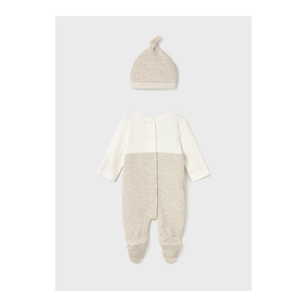 El gorro a juego añade un toque especial al conjunto, manteniendo la cabecita del bebé abrigada y protegida. Confeccionado en el mismo tejido suave y cómodo que el pelele, garantiza confort durante todo el día.