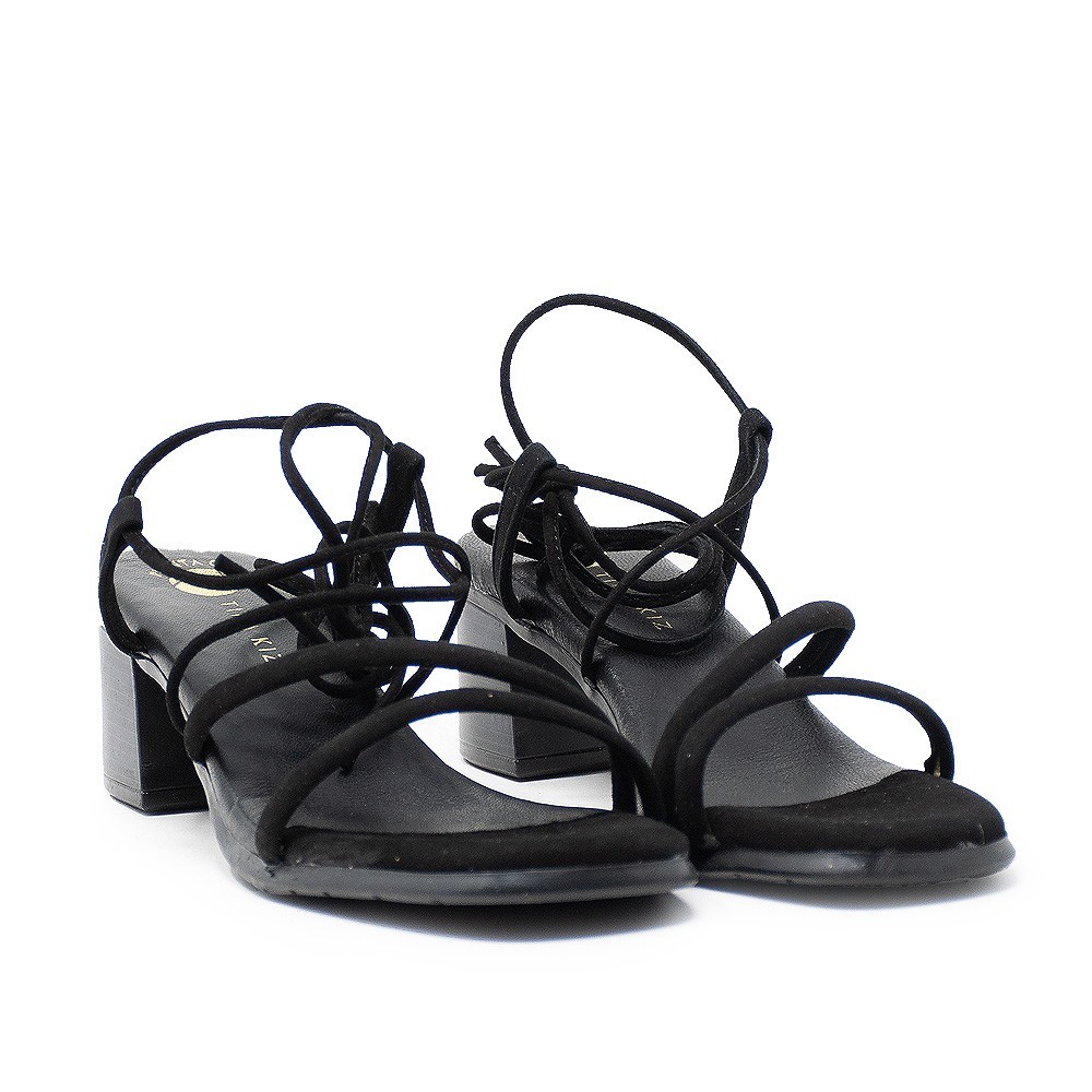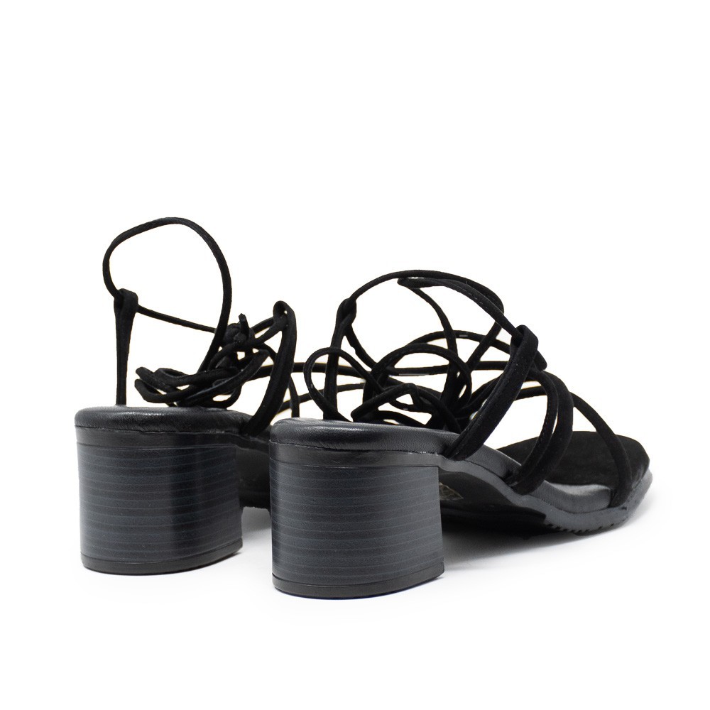 El material de ante negro le da a estas sandalias un toque de distinción y calidad, además de ser suave al tacto y cómodo de llevar. La altura del tacón es ideal para estilizar la figura sin sacrificar la comodidad, lo que las convierte en una opción perfecta para eventos formales o simplemente para darle un toque especial a tu outfit diario.