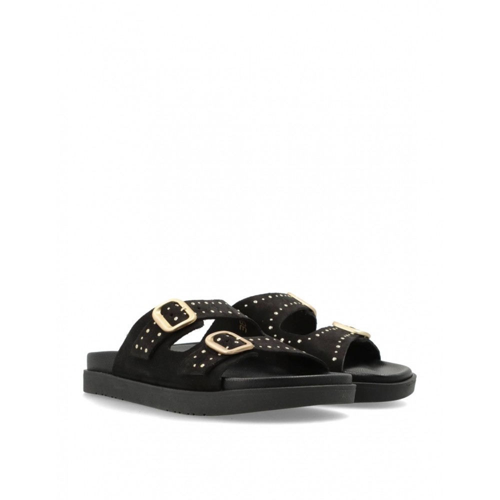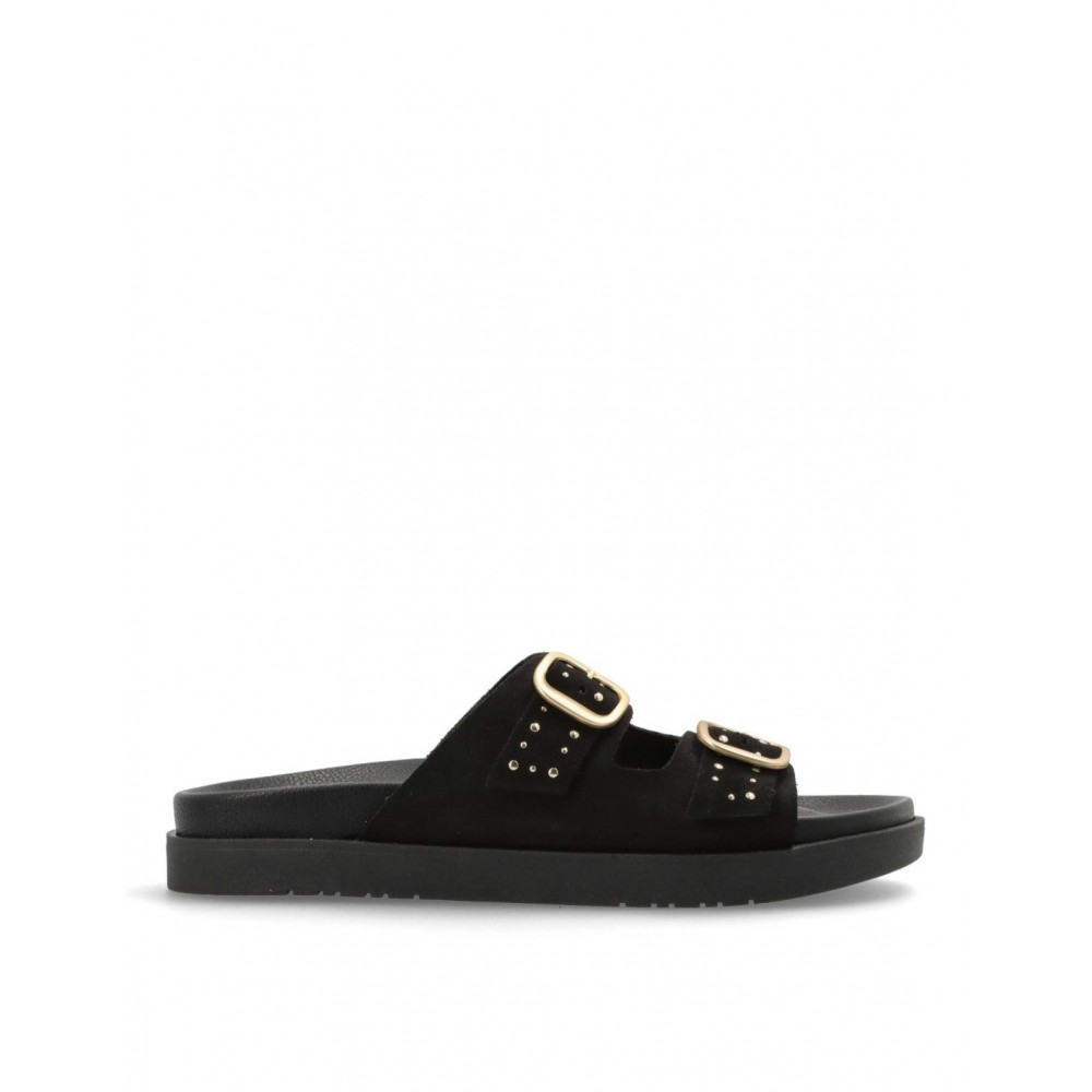 Estas sandalias están diseñadas con dos hebillas que permiten un ajuste personalizado para mayor comodidad. El material de serraje en color negro le da un toque elegante y versátil que combina fácilmente con diferentes outfits.