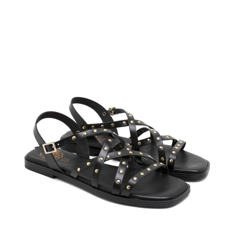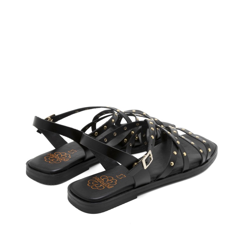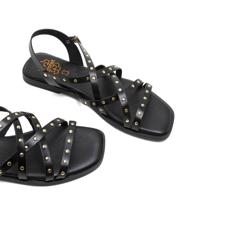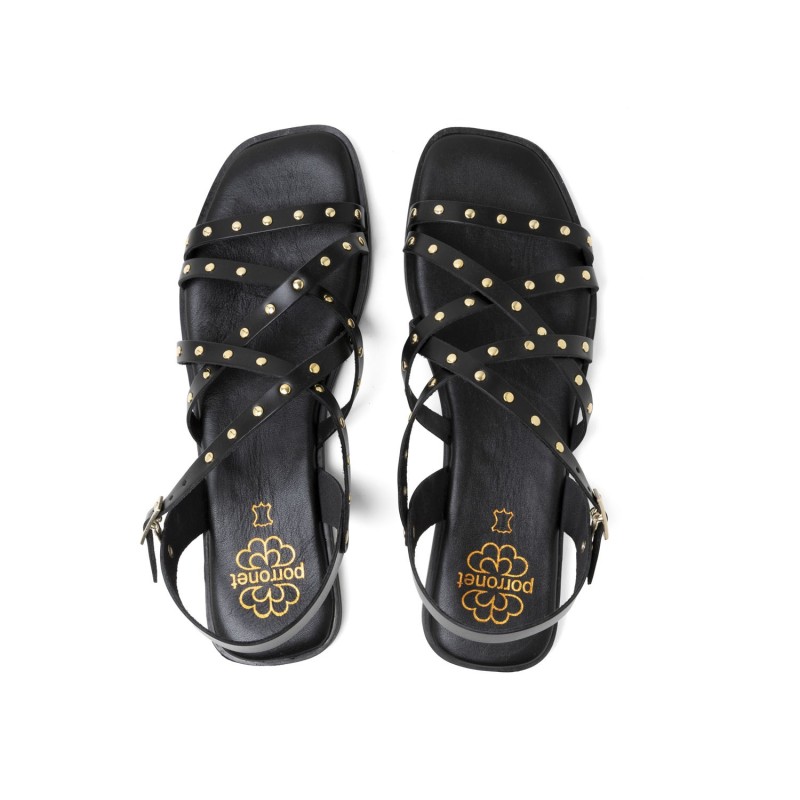 Las sandalias planas de mujer ROMANA TIRAS REMACHES NEGRO de la marca PORRONET son el complemento perfecto para tus looks de verano. Con un diseño moderno y elegante, estas sandalias destacan por sus detalles de tiras cruzadas y remaches que le dan un toque sofisticado.