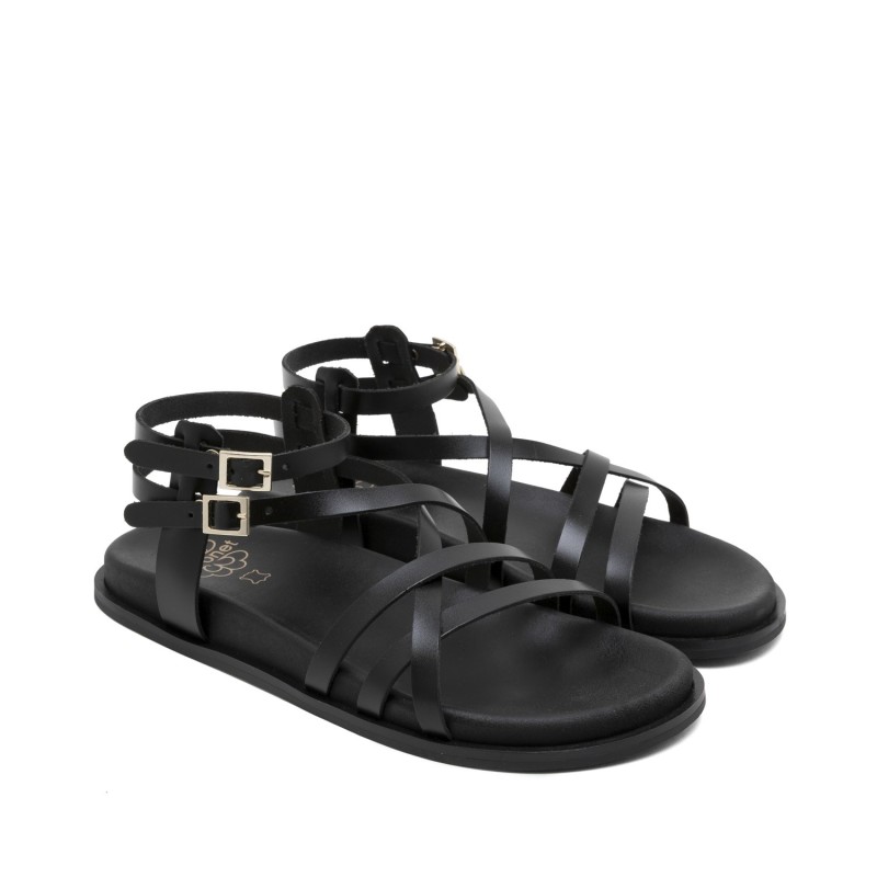 Estas sandalias están confeccionadas en piel sintética de alta calidad en color negro, lo que las hace versátiles y fáciles de combinar con cualquier prenda. Su diseño de tiras entrecruzadas y dos hebillas ajustables en el tobillo le dan un toque moderno y sofisticado a tu look.