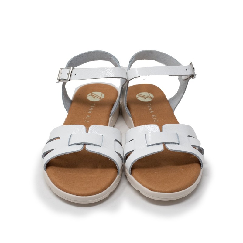 El color blanco de estas sandalias aporta un toque de frescura y versatilidad, permitiendo combinarlas fácilmente con vestidos, faldas o pantalones cortos. Su cierre ajustable permite un calce seguro y cómodo, adaptándose a la forma del pie de tu hija.