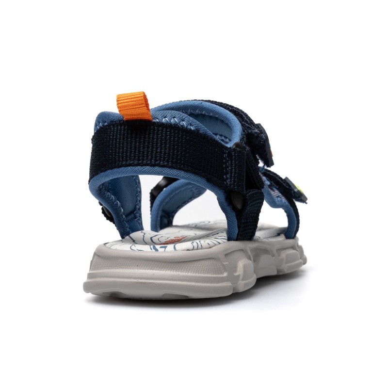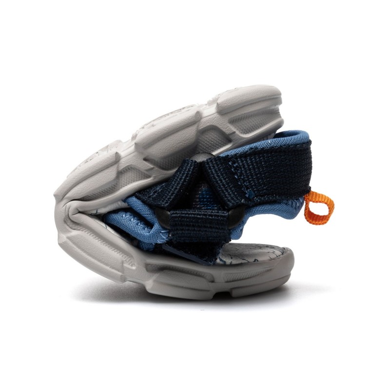 El diseño de estas sandalias destaca por su estampado camuflaje en tonos navy y royal, que le da un toque moderno y original. Además, su suela plana ofrece una pisada cómoda y estable, ideal para acompañar a tu hijo en todas sus aventuras diarias durante el verano.