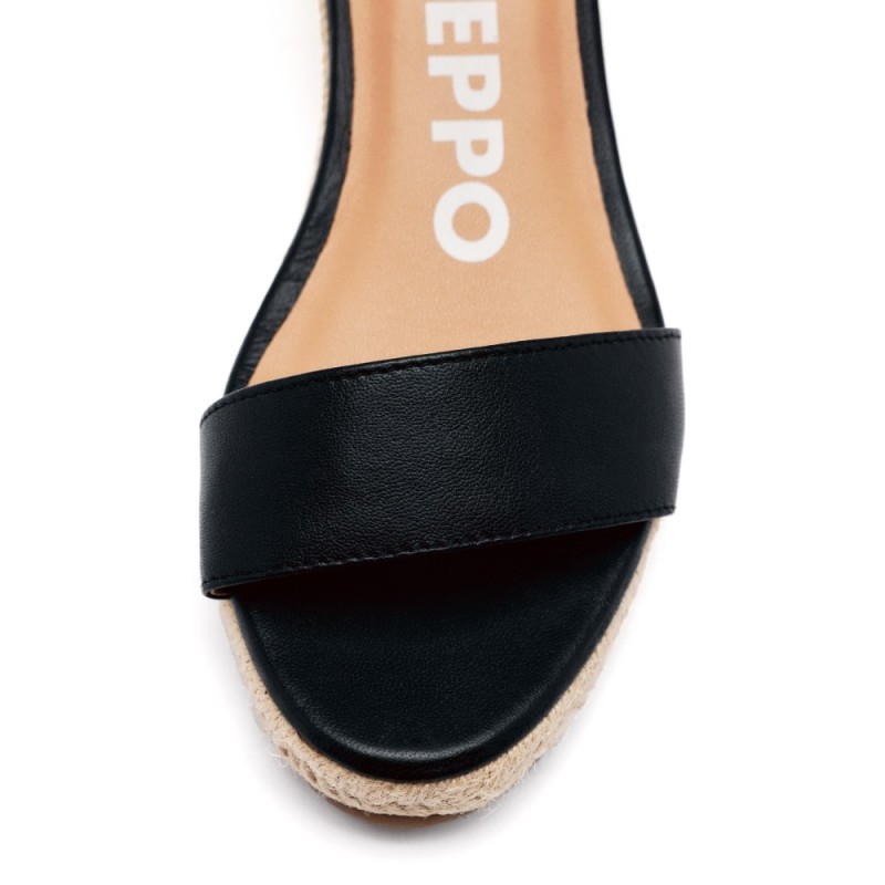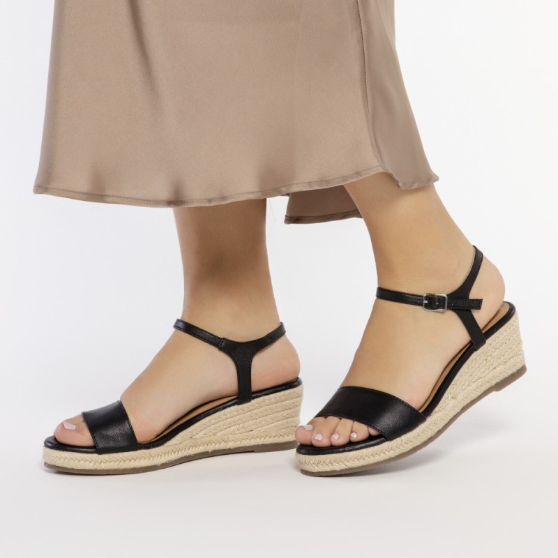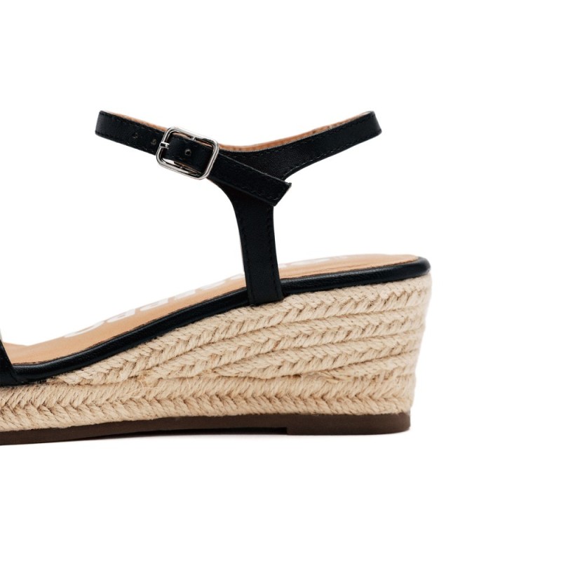 Confeccionadas en piel sintética de alta calidad, estas sandalias cuentan con una cuña de yute que aporta un toque rústico y natural. El color negro es atemporal y fácil de combinar con todo tipo de outfits, desde vestidos ligeros hasta vaqueros.