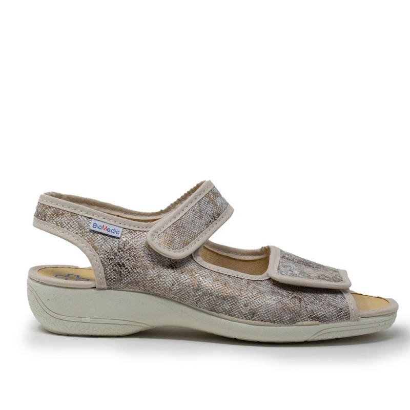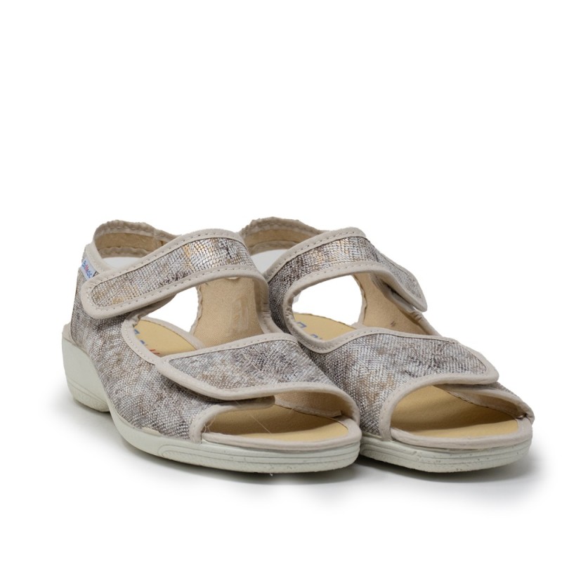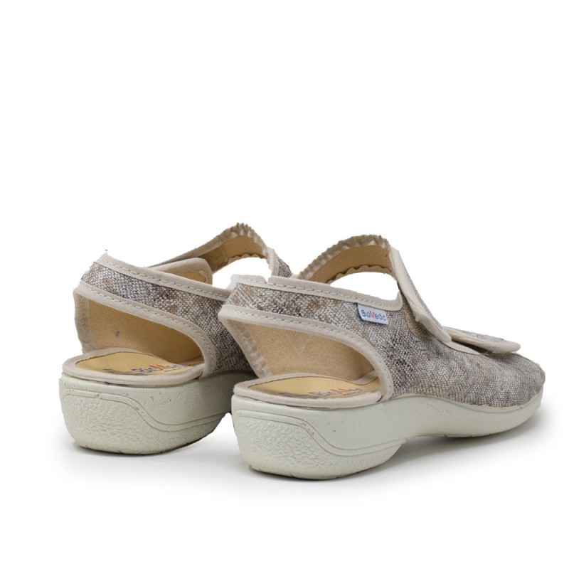 Estas sandalias están fabricadas con materiales de alta calidad que garantizan durabilidad y resistencia. La parte superior está confeccionada en un suave tejido damasco color beige que aporta un toque de sofisticación a tu look. Además, cuentan con dos prácticos cierres de velcro ajustables en el empeine para que puedas adaptarlas a la medida de tu pie y asegurar una sujeción óptima.