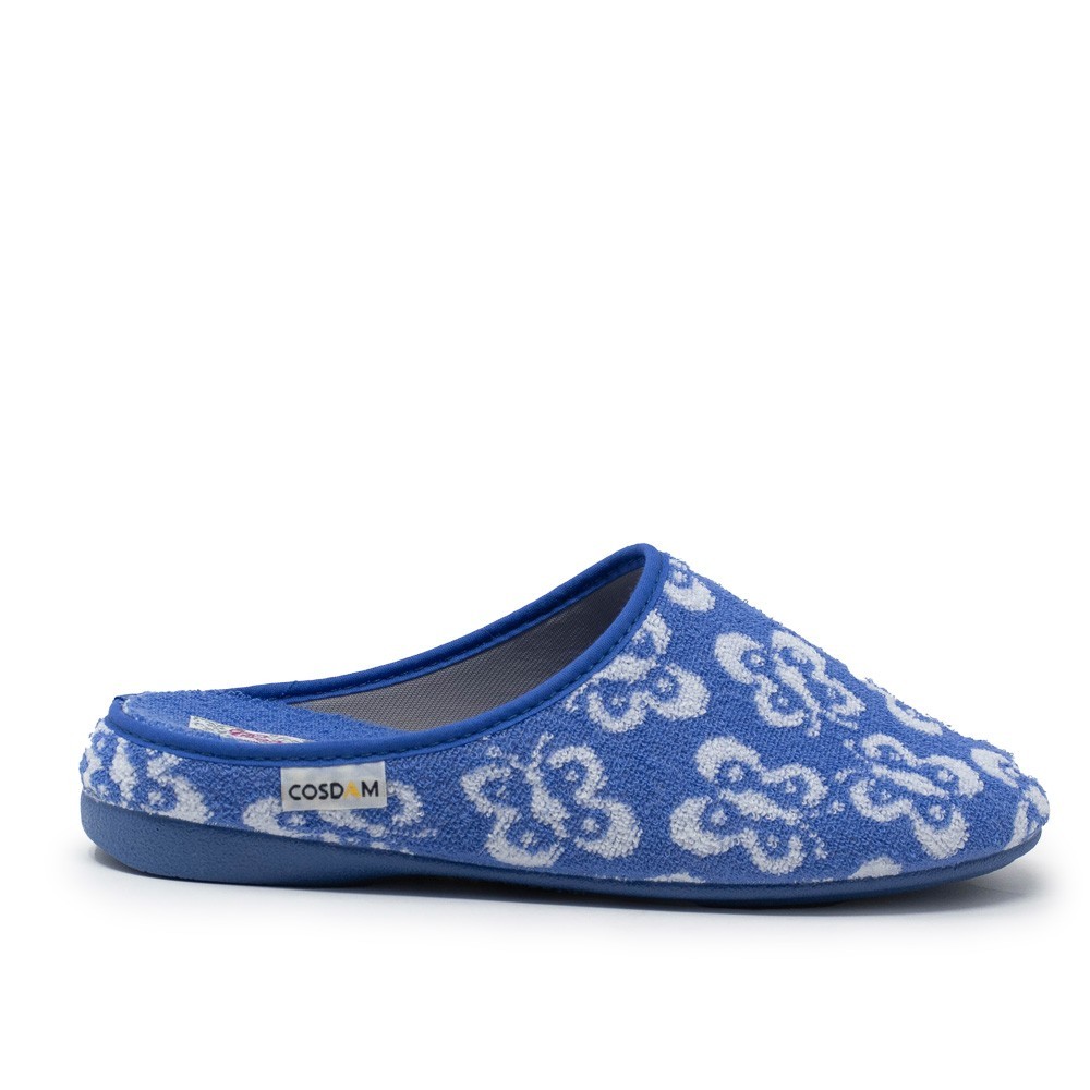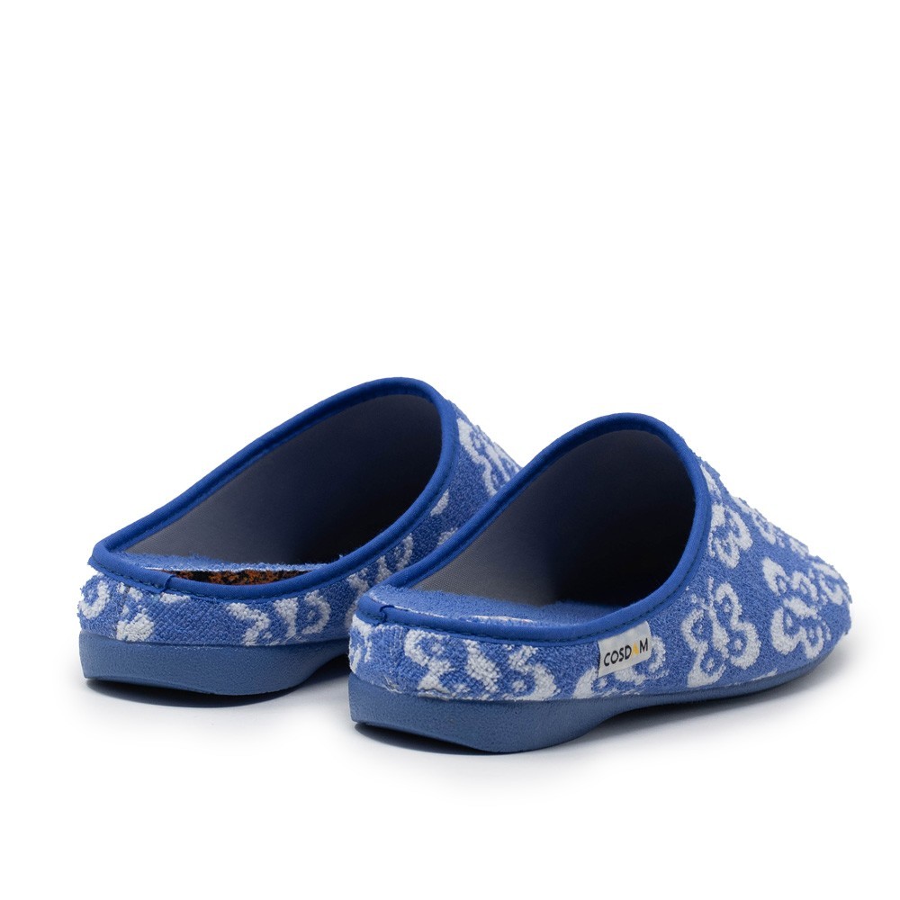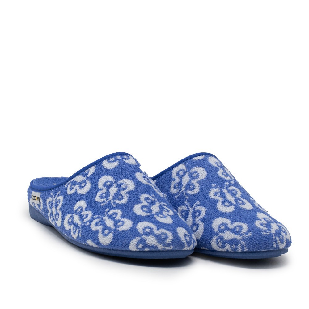 Estas chinelas están fabricadas con materiales de alta calidad que garantizan durabilidad y confort. La parte superior está confeccionada en un suave tejido de color indigo, adornado con un bonito estampado de mariposas que le da un toque femenino y alegre.