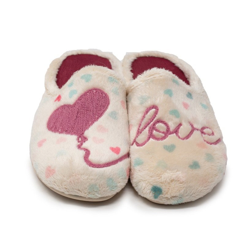 Estas zapatillas están fabricadas con materiales de alta calidad que garantizan durabilidad y comodidad. La parte superior está hecha de suave tela marfil con un estampado LOVE en color rosa, que le da un toque femenino y encantador. El interior está forrado con una suave tela que mantendrá tus pies abrigados en los días fríos.