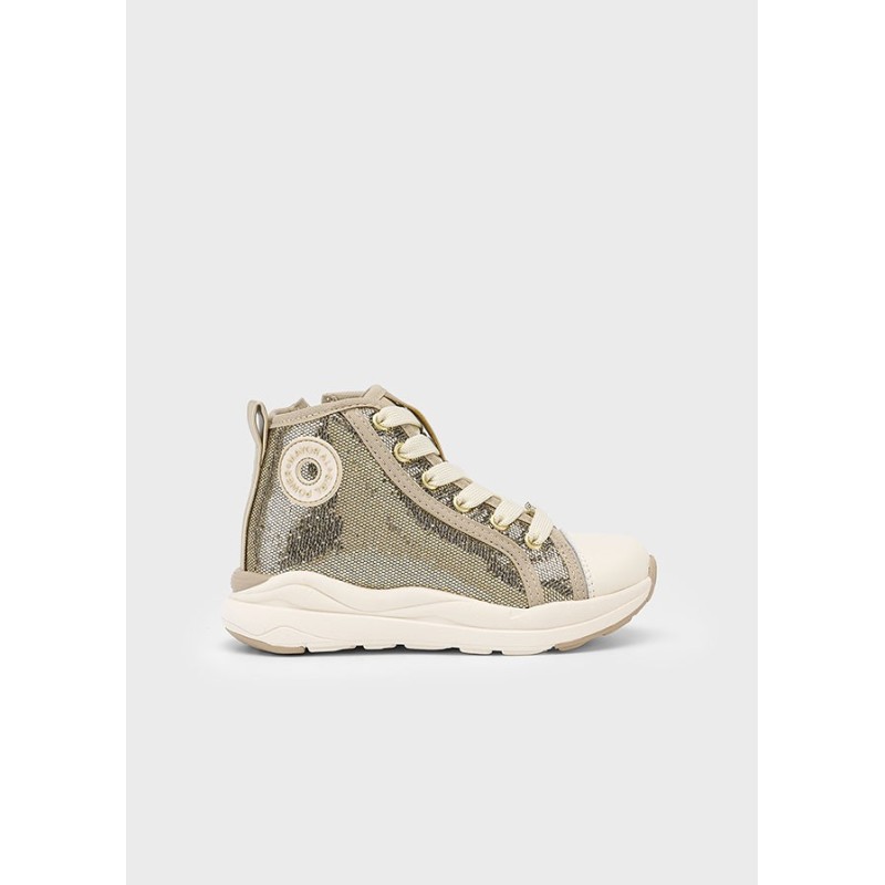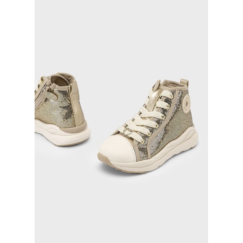 Los sneakers botín oro de la marca Mayoral son el complemento perfecto para el outfit de tu pequeña. Con un diseño moderno y elegante, estos zapatos son ideales para cualquier ocasión.