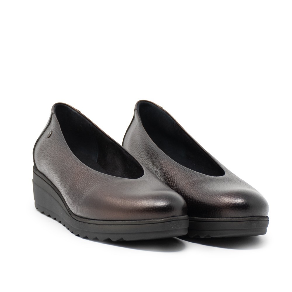 Este salón cuenta con una cuña de altura media que proporciona un buen soporte al caminar, evitando la fatiga en tus pies. El color cobre le da un toque único y versátil que combina fácilmente con diferentes outfits, ya sea para ocasiones formales o informales.