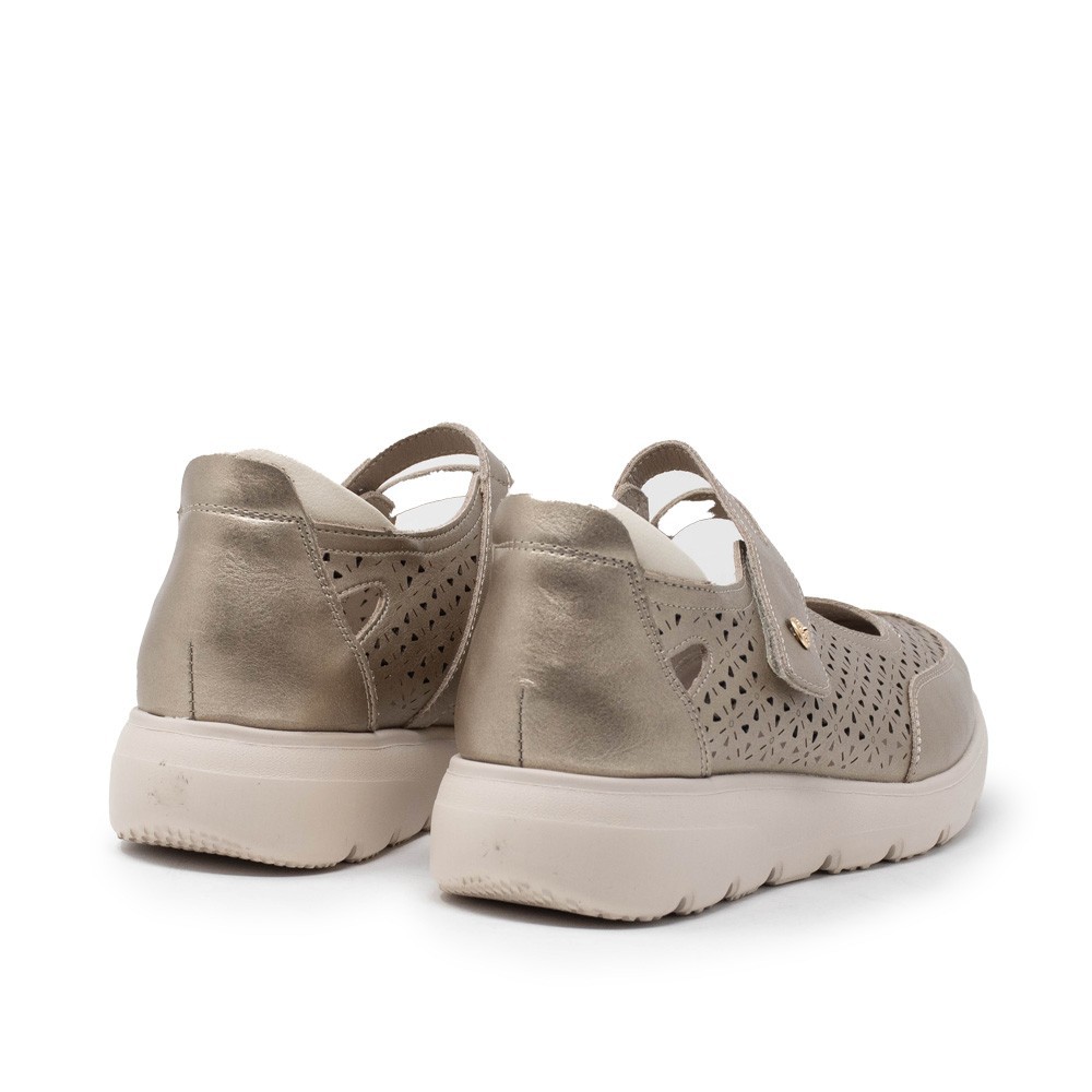 La combinación de color bronce agrega un toque de glamour a estos zapatos, haciéndolos ideales para lucir con pantalones, faldas o vestidos. El cierre de velcro garantiza un ajuste seguro y cómodo, permitiéndote caminar con confianza en todo momento.