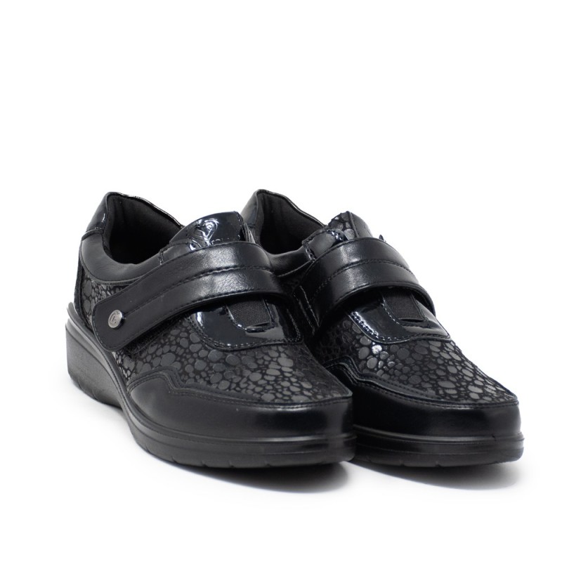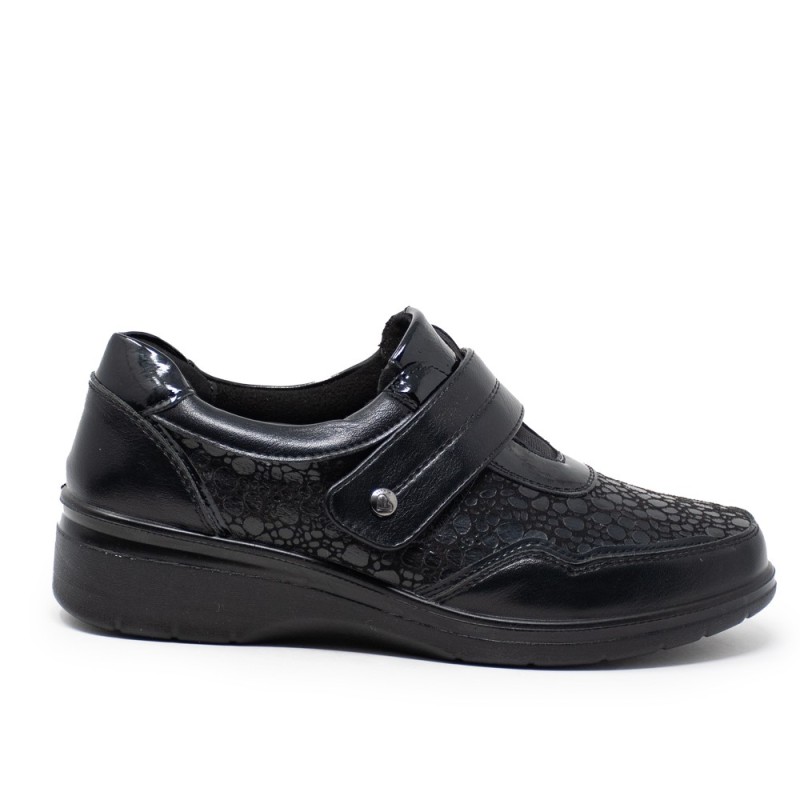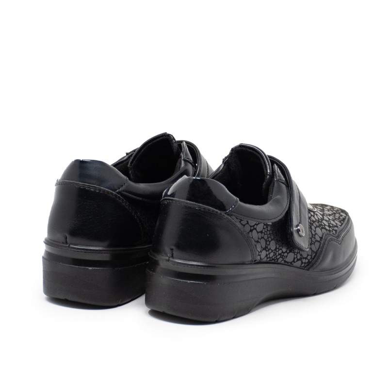 Este zapato está diseñado con un exterior en piel sintética de alta calidad con un acabado tipo escamas que le otorga un toque único y sofisticado. El color negro es atemporal y fácil de combinar con todo tipo de prendas, desde jeans hasta vestidos.