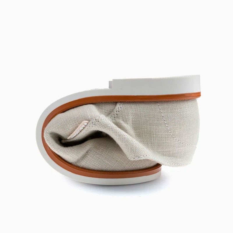 Estos zapatos están fabricados con materiales de alta calidad que garantizan durabilidad y comodidad. La parte exterior está confeccionada en lino de color beige claro, lo que le da un toque sofisticado y versátil que combina fácilmente con diferentes estilos de ropa. La suela es resistente y proporciona un buen agarre, ideal para que tu hijo pueda jugar y moverse con total seguridad.