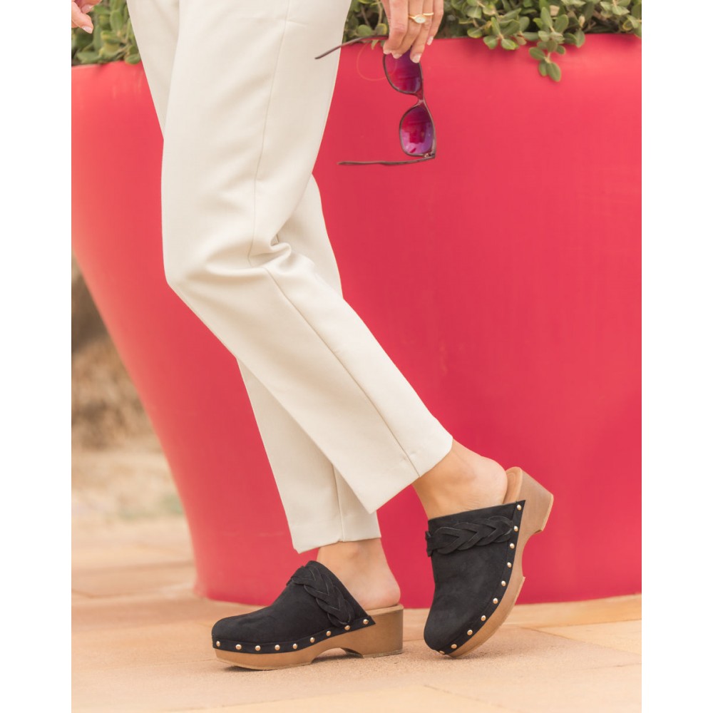 Estos zuecos están fabricados con materiales de alta calidad para garantizar durabilidad y confort. La madera utilizada en la suela proporciona una base resistente y estable para caminar, mientras que el diseño en color negro le da un toque sofisticado y versátil que combina con cualquier outfit.
